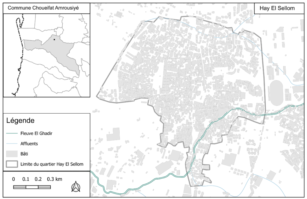 Le quartier de Hay El Sellom, situé dans la banlieue sud de Beyrouth, est un quartier informel qui s’est développé sur des terrains agricoles non[P1] planifiés. Il est maintenant surpeuplé, avec une majorité de Libanais chiites et de réfugiés syriens. Les constructions illégales dans le lit du fleuve « El Ghadir » causent des inondations saisonnières aggravées par les déchets et l’imperméabilisation des sols. Dans ce quartier, les inondations sont considérées comme une « exception normalisée » (Agier, 2015).