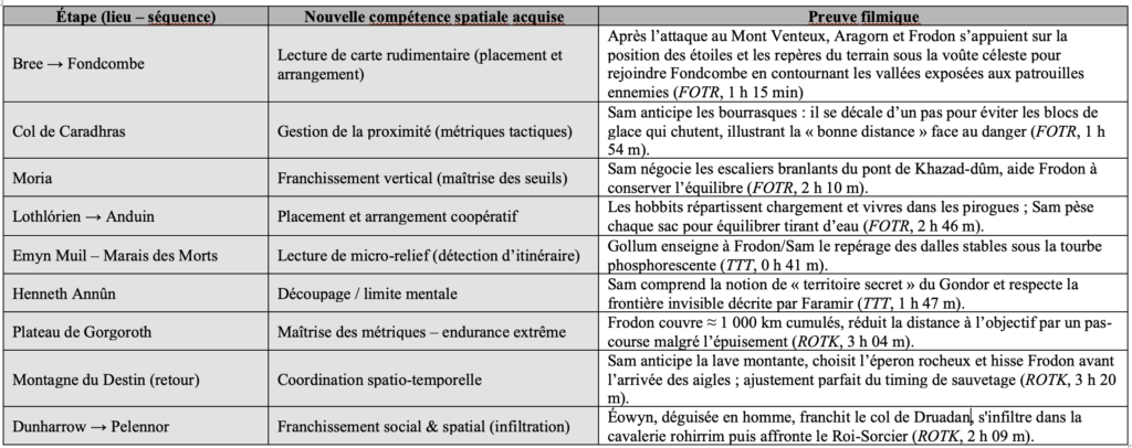 (Tab. 1 – Progression des compétences spatiales au fil du voyage.Le tableau suit, étape par étape, l’enrichissement du capital spatial des hobbits : à chaque portion de route, une nouvelle aptitude se manifeste (placement tactique, franchissement, maîtrise des métriques) et prépare la réussite finale. Les minutages renvoient à la version longue des films).