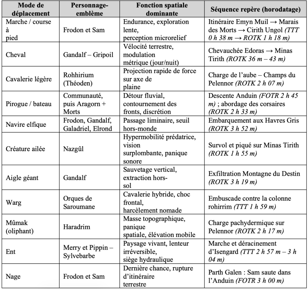 La cartographie auditive prolonge ce dispositif : des répliques fixent des délais (« deux jours pour rassembler les Rohirrim », « […] trois jours à vol de Nazgûl », cavaliers ailés de Sauron) et convertissent la durée physique en durée parlée, stabilisant l’orientation du public. Plus un trajet porte d’enjeux tactiques ou initiatiques, plus le film le dilate ; s’il ne sert qu’à franchir un vide topographique, il disparaît. La Terre du Milieu se parcourt par une palette de modes (charrette, marche, cheval, navire, vol, créatures de guerre), chacun indexé sur un capital spatial : Gripoil accélère Gandalf ; l’aigle offre la verticalité ; Frodon et Sam, cloués au sol, incarnent la lenteur exploratoire. Les modes rares (aigles, navires elfes) signalent un capital spatial exceptionnel. Cette multimodalité exprime une hiérarchie de compétences et un « habiter pluriel » (Stock, 2005a ; 2005b ; 2015 ; Lazzarotti, 2006) : changer de mode requalifie le lieu traversé, reconfigure le statut de celui qui s’y déplace, et inscrit l’effort sur les corps.