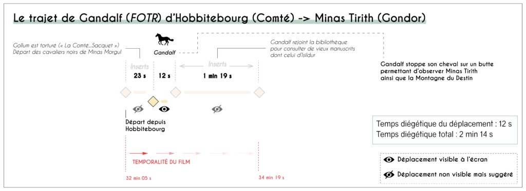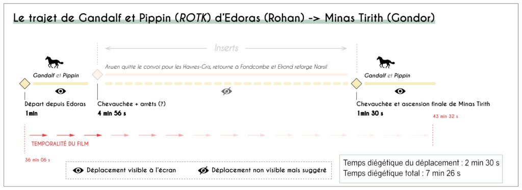 Premier paradoxe : la durée diégétique et la durée à l’écran se décorrèlent. Comme le rappelle Staszak (2014), « l’expérience cinématographique est essentiellement celle d’un déplacement » ; la trilogie en fait un principe de montage. Le trajet de Gandalf de Hobbitebourg (village hobbit de la Comté, région d’origine) à Minas Tirith (capitale du Gondor) — env. 2 600 km in-universe — est réduit à un fondu d’environ 22 s : la route ne sert qu’à confirmer l’authenticité de l’Anneau. À l’inverse, le trajet plus court d’Edoras (capitale du Rohan, royaume de cavaliers) à Minas Tirith avec Pippin (ROTK) dure près de 2 min 30, scandé par l’alternance jour/nuit, un travelling latéral sur Gripoil (son cheval) et des plans aériens et des inserts narratifs (Arwen vers les Havres Gris, ports elfes ; Elrond reforgeant Narsil, épée royale). Le temps d’écran dépend donc de la quantité d’information dramatique à délivrer, non des kilomètres. Cette élasticité hiérarchise les itinéraires. Un déplacement-pilote domine : la marche de Frodon et Sam vers la Montagne du Destin, au cœur du Mordor (territoire ennemi). Autour, des trajets satellites (Aragorn/Legolas/Gimli ; Gandalf ; Merry-Pippin) deviennent visibles ou non selon leur utilité immédiate à l’enjeu de l’Anneau. Quand les Uruk-haï (soldats orcs) emportent Merry et Pippin (TTT), la poursuite occupe longuement l’écran : la mobilité devient l’événement. À l’inverse, l’aller-retour de Gandalf aux archives de Minas Tirith (FOTR) est presque hors champ — départ et retour, sans route, car l’enjeu est la découverte d’un parchemin. Les déplacements deviennent ainsi des « tampons cinétiques » : ils s’étirent pour fabriquer l’attente (chevauchées collectives) ou se contractent pour dégager l’action (infiltration, combat).